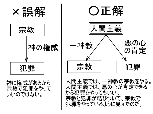 ところで、今の政府がやっている宗教は「神に因[ちな]んだことなら何でもやっていい」ことである。[いくらローマが犯罪にルーズな国でも、こんな宗教があるわけがない。宗教がこんな定義になったのは、近代の小説家のフィクションが原因らしい。例えば、芥川龍之介は親が武士だったために幕府方[ばくふがた]の作家だったので、政府をイメージダウンさせて政府を攻撃するために「神に因めば悪事ができる」という嘘[うそ]の作り話を考え出したのである。…しかし、私は言いたい。「小説は無法地帯ではない」と。]政府は宗教で殺人事件を起こして大勢の罪のない国民を殺している。こんな宗教があると国がメチャクチャになる。だから、法律で政府がやっている宗教を禁止しなければならない。