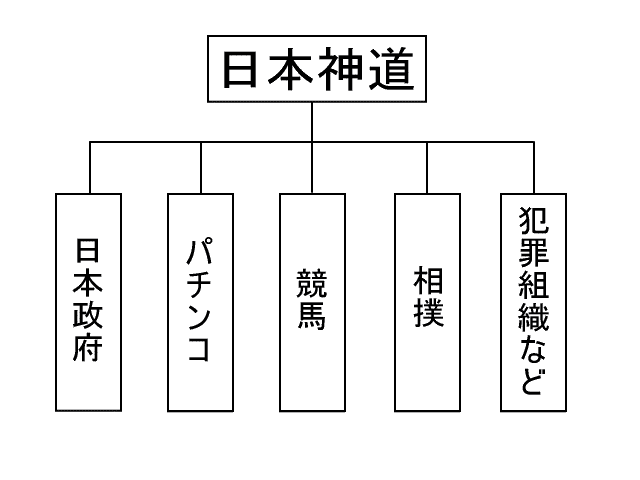 日本神道は植民地政策をすることを正規のサービスとし、植民地政策をしない時期には駄洒落[だじゃれ]で神武天皇の話を広げてくだらないこと(例、パチンコ、競馬、相撲など)を国民にさせるのをサービスとしている宗教団体である。