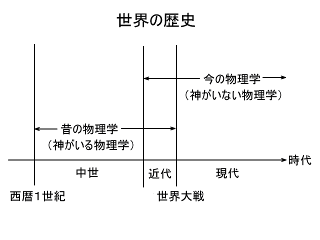 実際には、今の人々は神がいないと思っているから、今は神がいない時代である。今の物理学には神がいないから、今の物理学で作られた世界の中で暮らす人々はひとりでに神がいないと思うようになるのである。