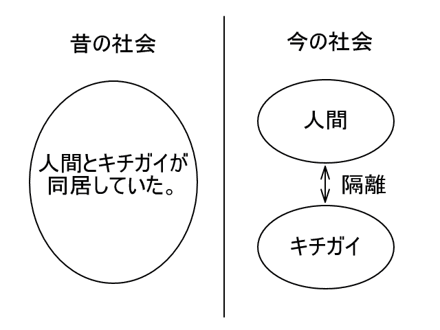 昔は法律がなかったから、正常者と精神異常者の区別ができなかった。そのため、正常者と精神異常者が同じひとつの社会の中にいたから、正常者が精神異常者によってひどい目にあわされた。今は法律があるから、正常者と精神異常者の区別ができる。そのため、正常者と精神異常者が別のところに住んでいるから、正常者が精神異常者によって嫌な目にあわされなくてもよくなったのである。