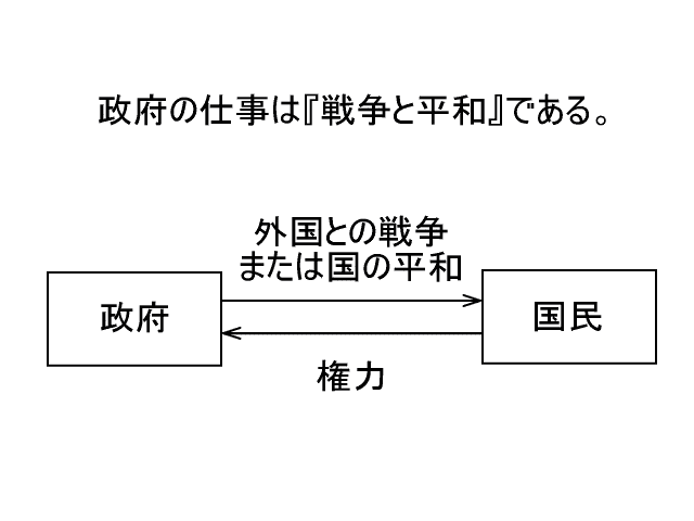 政府の仕事は外国と戦争をすることと、国内の戦争を鎮[しず]めて国を平和にすることの2つである。つまり、政府の仕事は『戦争と平和』だけであって、その他[た]のことは政府の仕事ではないのである。