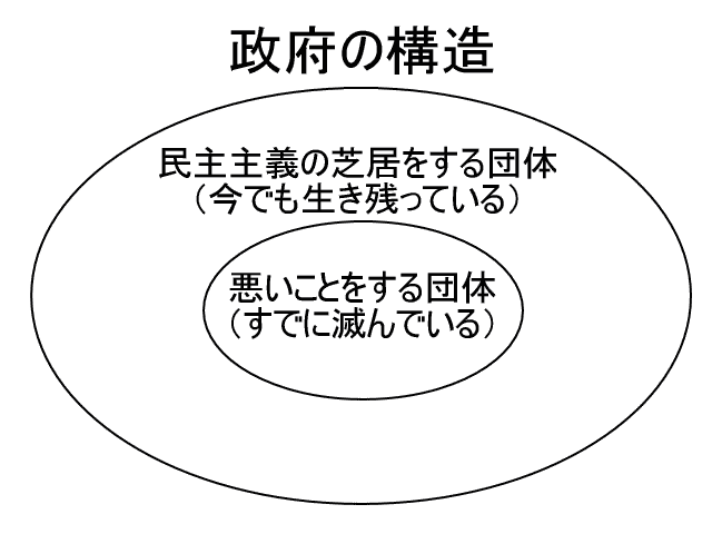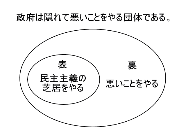 政府は表で自分が悪いことをしていないふりをすればいい。つまり、政府は表で悪いことをしない者のふりをすればいい。悪いことをしない者は民主主義の団体である。だから、政府は表で民主主義の団体のふりをしているのである。政府は表で民主主義の団体の芝居をやっているのである。政府が表でやっているのは、民主主義の団体の芝居なのである。