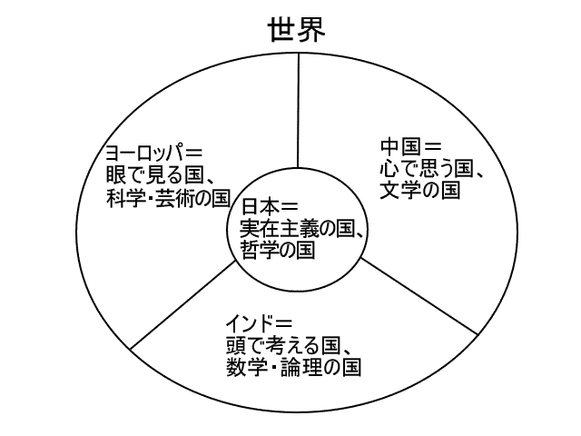 日本文化は『人間は眼と頭で実在を知って実在に適応して実在の中で眼で見て実在の中で自分の心を満足すれば幸福になる。人間が幸福であるためには眼と頭と心の全部を使わねばならない。実在が大事である。』と考えて実在の決まりである『人間はみな平等である』ことを守って悪いことをしない。日本文化は実在を知って科学をやる。日本文化では人間が科学を使って心を満足してみんなが幸福に暮らすのである。日本文化はヨーロッパ文化とインド文化と中国文化が統合された国際的文化である。今は国際化の時代だから、日本人は日本文化をやって生きていけばいいのである。