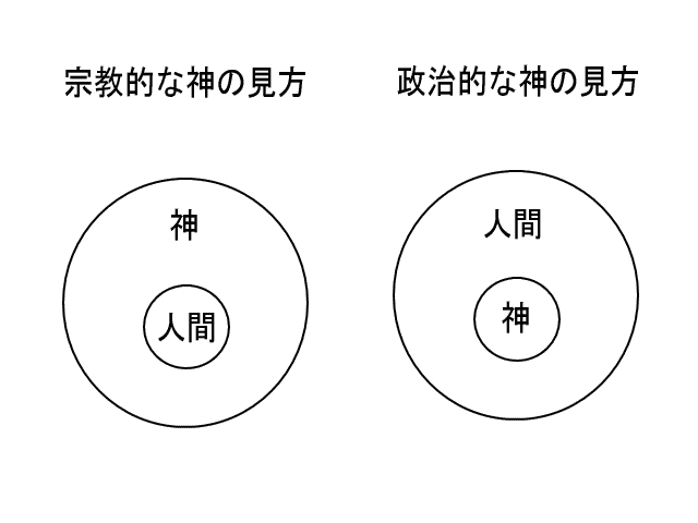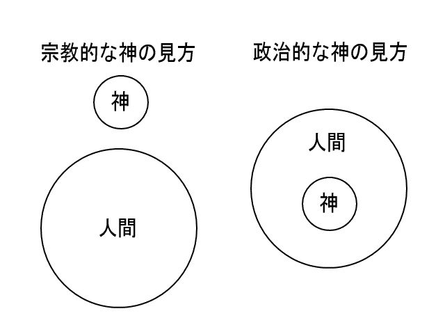 権威者の意見は権威が大きいほど通りやすいが、何でも意見が通るわけではない。例えば、引退した野球選手にいくら権威があっても、国際政治について意見を述べたところで、しょせんは素人[しろうと]談義だから、その意見がそのまま通るわけではない。同様に、神に権威を置くのはかまわないが、神に政治的才能がなければ、神を政治組織に組み込んではいけない。ただ神に個人的な権威を認め、国は神を生み出したものとして権威が与えられるだけでいい。