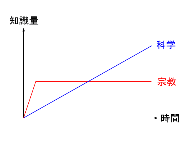宗教は発達するのが早かったがそこから先に進歩せず、結局最後にはゆっくり確実に成長した科学に追い越された。[天皇制がカニのように横這[ば]いなのも、宗教が発展しない学問だからである。]