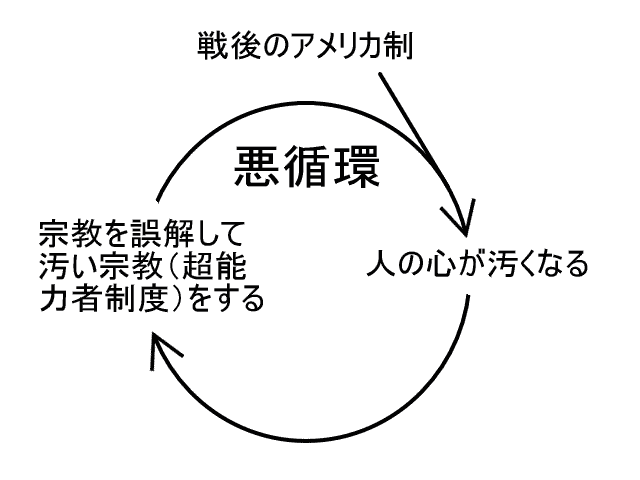 心の汚い者が宗教を誤解して汚い宗教(つまり超能力者制度)をするから、ますます人の心が汚くなる。これでは悪循環だ。