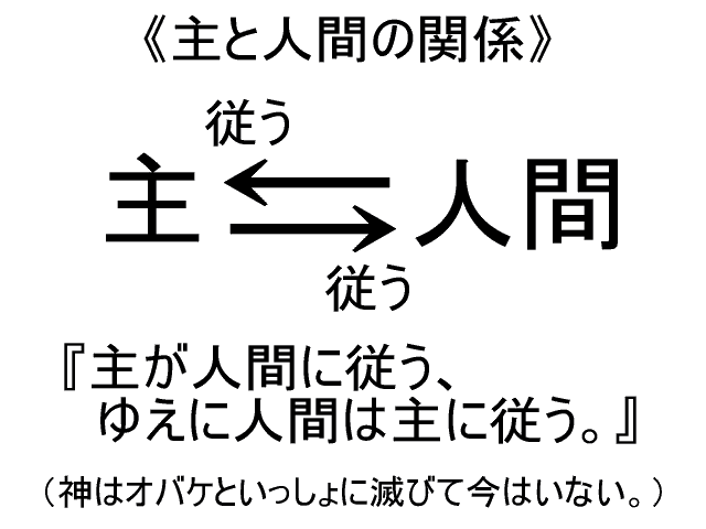 一方、主とは、民族の神話やおとぎ話を組み合わせて作った聖典の物語の主人公のような、国民(本来は民族)の心の代表者である。主は国民に従うがゆえに、逆に国民は主に従い、主[しゅ]は国民の主[あるじ]となりえたのである。いわば、主とは民主主義社会における政治家みたいな者だ。