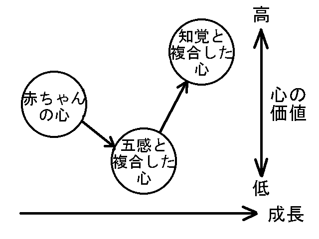 つまり、赤ちゃんの純粋な心は、将来知覚と複合する可能性があるという点で、子供の五感と複合した心よりは上だ(価値が高い)が、大人の知覚と複合した心よりは下な(価値が低い)のだ。